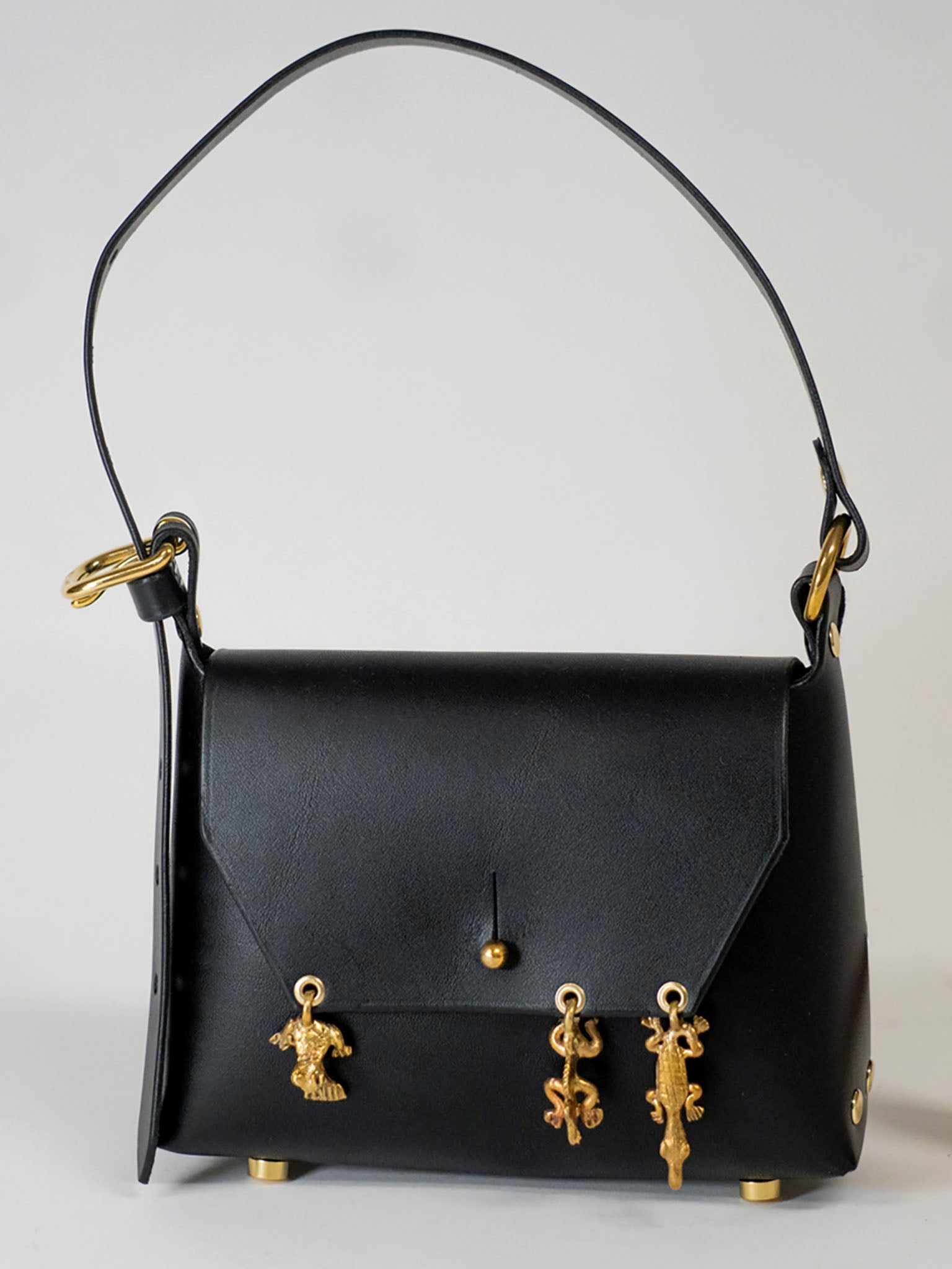 The Creature Charm Bag is an envelope style design fixed with custom hand sculpted Solid Brass Creature Charms. Each Charm was hand ground and set into the edge of the leather closure. Their sonic resonance and theatrical / mystical attributes gift each charm a presence of its own. No two charm bags feature the same creatures*